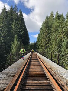 The cherry on top of this great day was a chance to stand on the actual tracks that will someday be the Salmonberry Trail. For those so inclined, they could bushwhack up a steep hill, assisted by a rope, to walk across the trestle hanging over a hundred feet in the air. This wasn’t easy in cycling cleats, but it was well worth it.