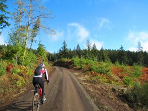 Saturday morning we woke up to pretty typical northwest Fall-in-the-forest conditions – that is to say it was foggy and a little rainy. But that didn’t deter the riders any. The rain did a nice job of taking care of the dust on the logging roads and the temperature was cool, but comfortable. And after that first hill, a 10% average grade climb, no one remained chilly for long. The routes for Gravel were “choose your own adventure” style with lots of opportunities to go your own way. But no matter which way you went, there were incredible vistas to take in, hulking logging equipment to see up close, and Autumnal splendor all around. And if you’re into bikes, about every make, style, and configuration of bike imaginable was represented.
