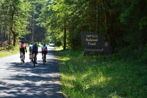 At mile 39, you’ll crest the second (and final) hilltop of the day at which time you can confidently shift from “uphill mode” to “downhill mode”. Take a minute to look to your left where you may just be able to make out Crater Lake in the distance. Hey, remember when we rode around Crater Lake? That was awesome! Now, sit back and let gravity take over as you cruise the remaining 20 downhill miles, being mindful of some steep stretches along a tree shaded road into Oakridge, where lunch and the rolling caravan of bicycle enthusiasts that is Cycle Oregon awaits your triumphant arrival.