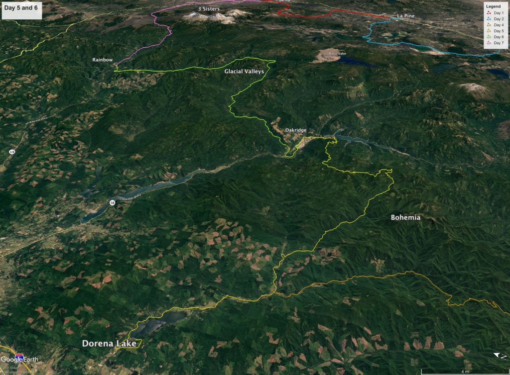 Figure 1. Overview of days 5 and 6. We will ride up the Row River drainage and into the Middle Fork of the Willamette on Day 5, and then will cross over into the McKenzie Drainage on Day 6. Both days we will be riding through steep canyons and the heavy forest of the Western Cascades.