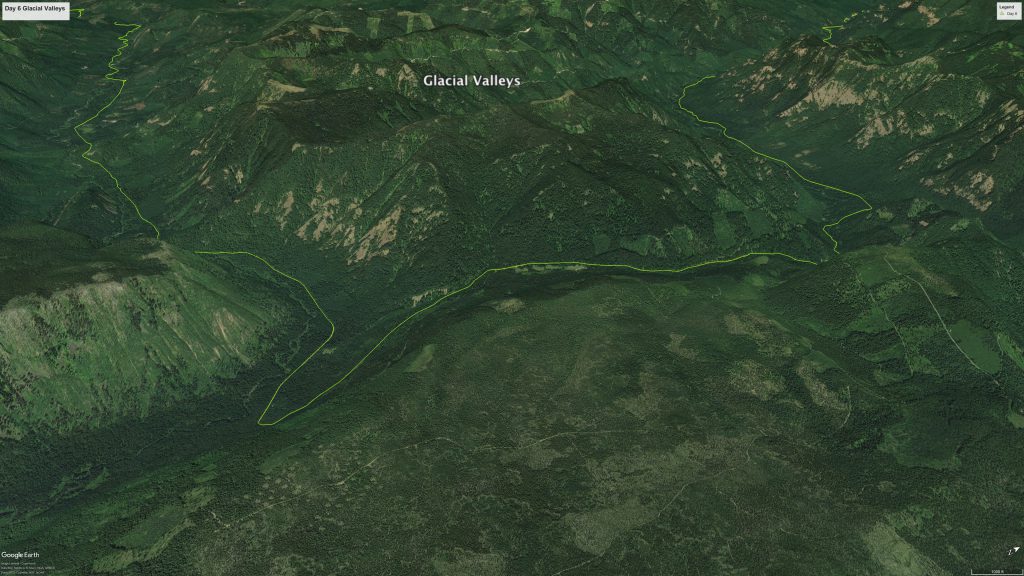 On Day 6, we will once again be riding through the poorly exposed volcanic rocks of the Western Cascades as we ascend the North Fork of the Middle Fork of the Willamette. We will start out riding in another deep, steep green canyon, like Brice Creek or Canton Creek on Days 5 and 4. By the time we get to our snack stop at Kiahane Campground, the terrain will change dramatically as we enter a wide valley with a flat bottom. This valley, and the the upper reaches of the South Fork of the McKenzie, have both been carved out by glaciers descending from the High Cascades (figure 3). In Figure 3, you can clearly see the broad “U” shape that is characteristic of glacial valleys.