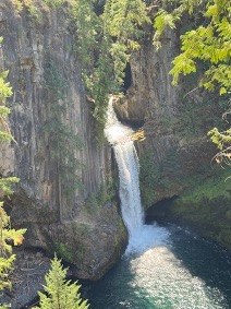 After the lava cooled, the river began to re-establish its course, flowing across the top of the canyon-filling lava until it cascaded down the steep front of the flow. The power of the water cascading down a 300-foot-high falls allowed the river to rapidly carve a new canyon through the lava, leaving the original lava surface high on the new canyon walls. In places, the river is still carving through the basalt, leaving beautiful waterfalls like Toketee Falls and cliffs shaped into fantastic columns as the lava cooled and shrank.