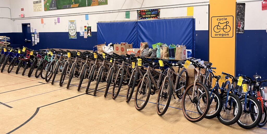 On Friday, November 21, 2025 at Dorena School in Dorena, Oregon, Cycle Oregon staff attended a special assembly to surprise 20 kids with  new bikes, helmets and riding accessories. The school has participated in our bike safety education programming since 2022 and we worked closely with school staff to identify need and select the students who would most benefit from the gift of a new bike.