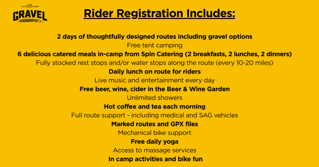 Back at camp, the daily after-hours lineup kicks in with live music under the stars, catered meals, cold craft beer, and that signature Cycle Oregon vibe. And don’t touch that dial—the Twilight Cup returns with our one-of-a-kind mix of oddball bikes and quirky challenges.
